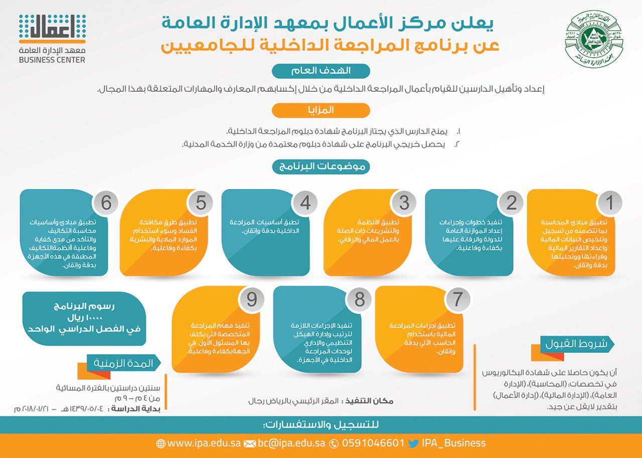 معهد الإدارة العامة On Twitter أعلن مركز الأعمال بالمعهد بالمركز الرئيسي بالرياض عن فتح باب التسجيل ببرنامج المراجعة الداخلية وبرنامج الدراسات القانونية للجامعين للفترة المسائية وتبدأ الدراسة اعتبارا من بداية الدراسة 4 5 1439هـ